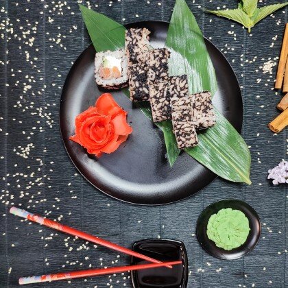Ролл с огурцом, кунжутом, помидором, лосось терияки, сыром плавленным.