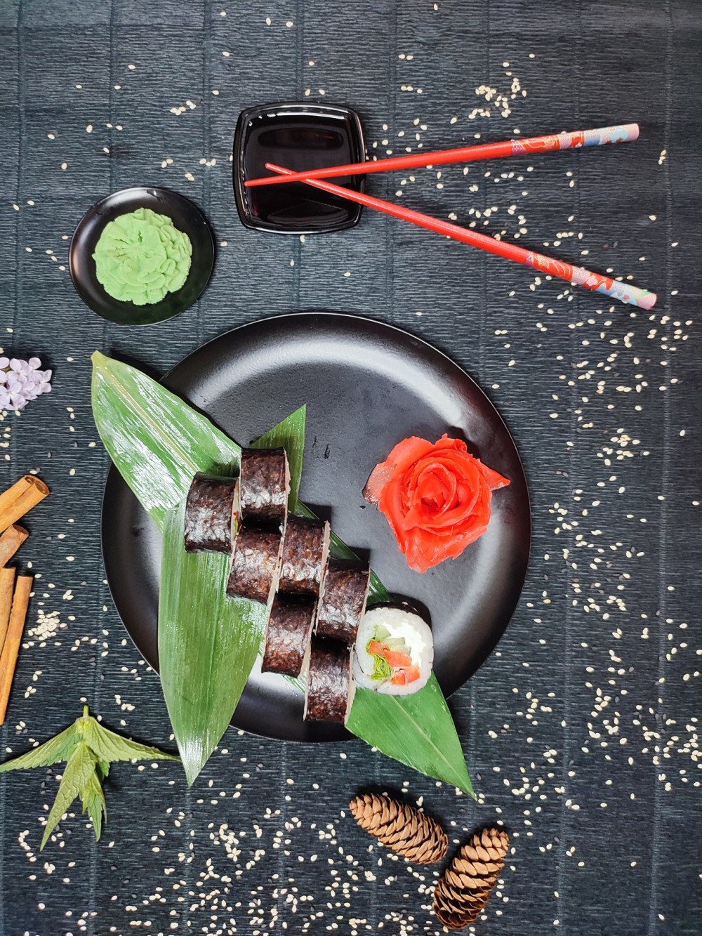 Нори, рис, огурец, сыр творожный, лист салата, перец