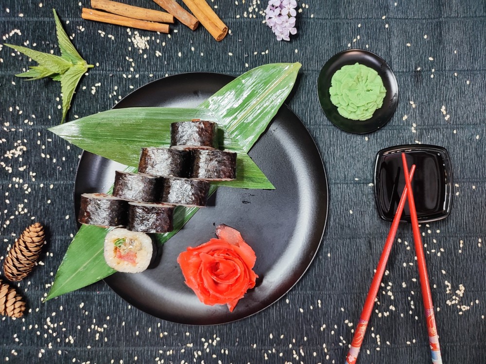 Нори, рис, соус Спайс, помидор, лосось терияки, лук зеленый