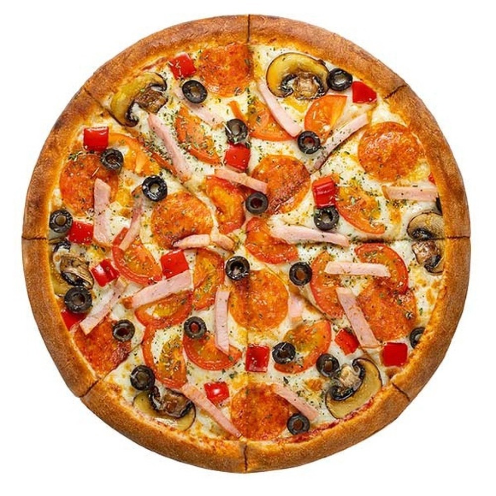 Состав: пепперони, цыпленок, шампиньоны, лук красный, маслины, помидоры, перец болгарский, орегано, сыр моцарелла