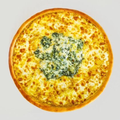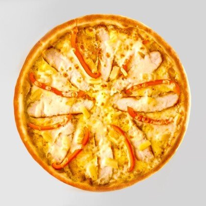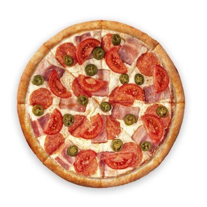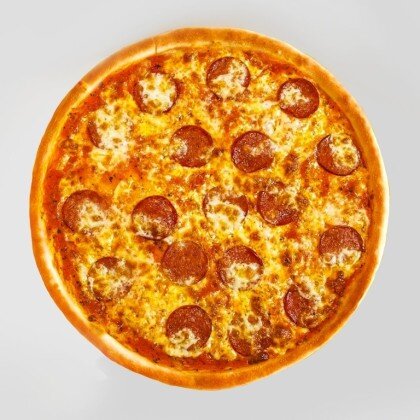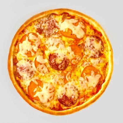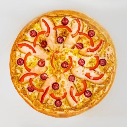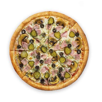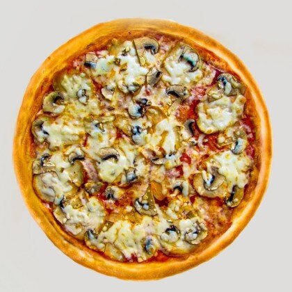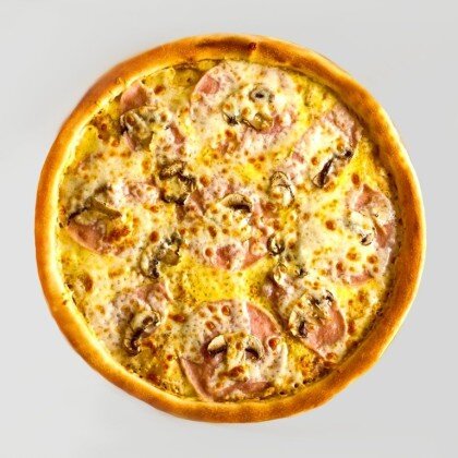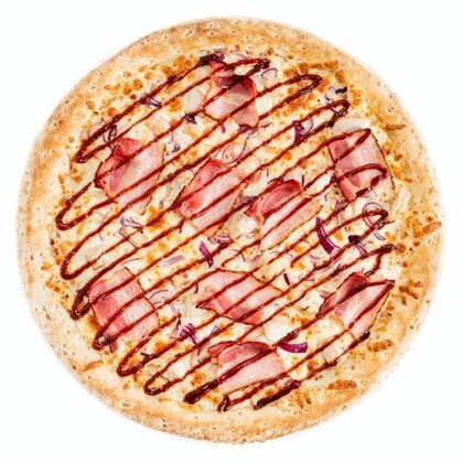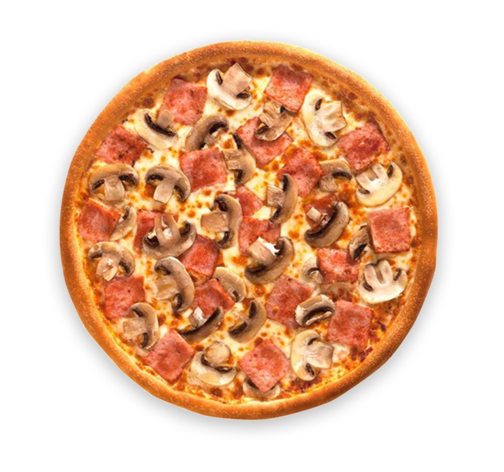 Соста:бекон, сыр моцарелла, грибы шампиньоны, колбаски охотничьи, соус чесночный