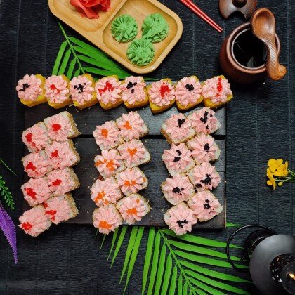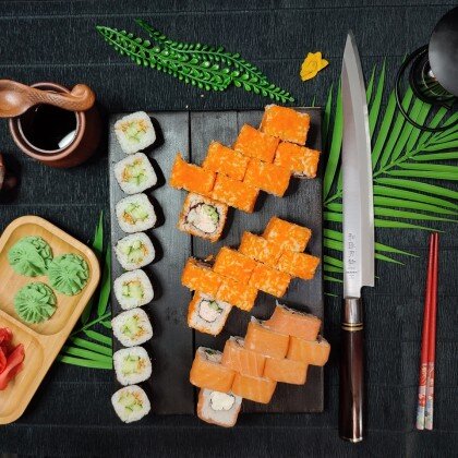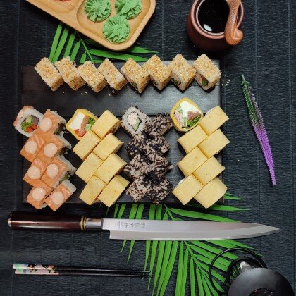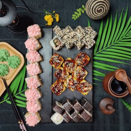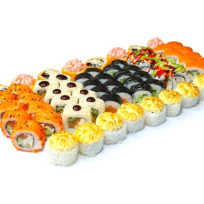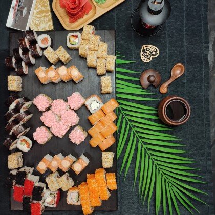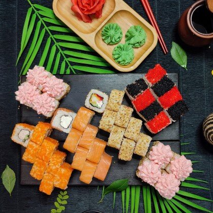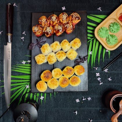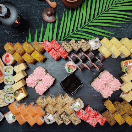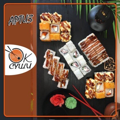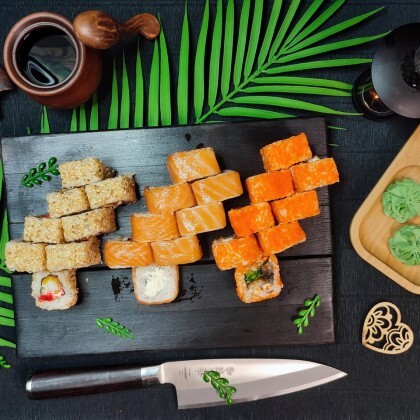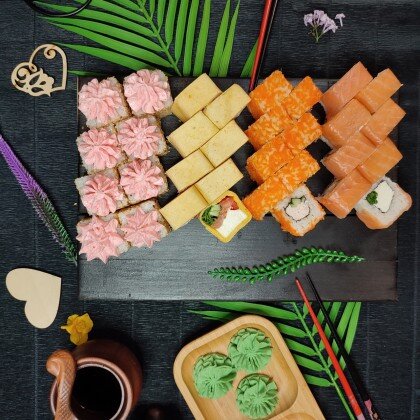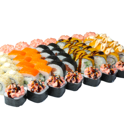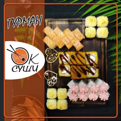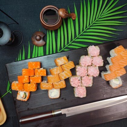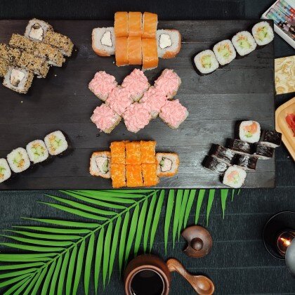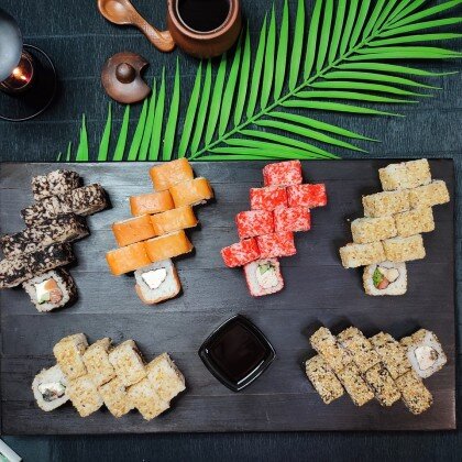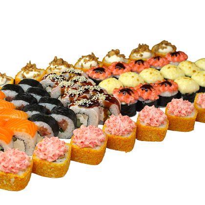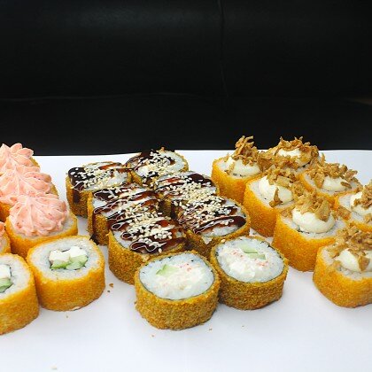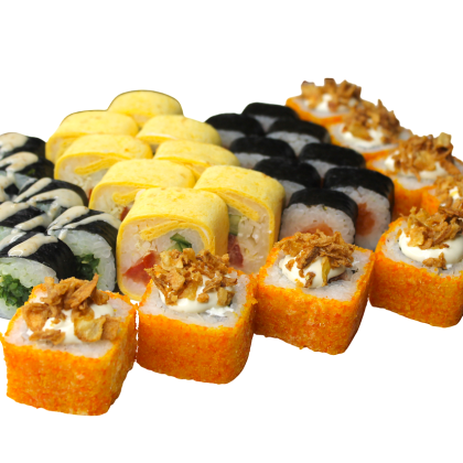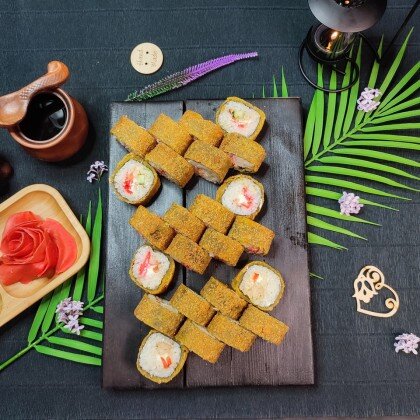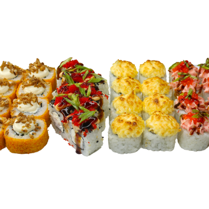 Состав: ролл «К;ани темпура», ролл «Калифорния », ролл «Цезарь», ролл «Америка», ролл «Чикен темпура»