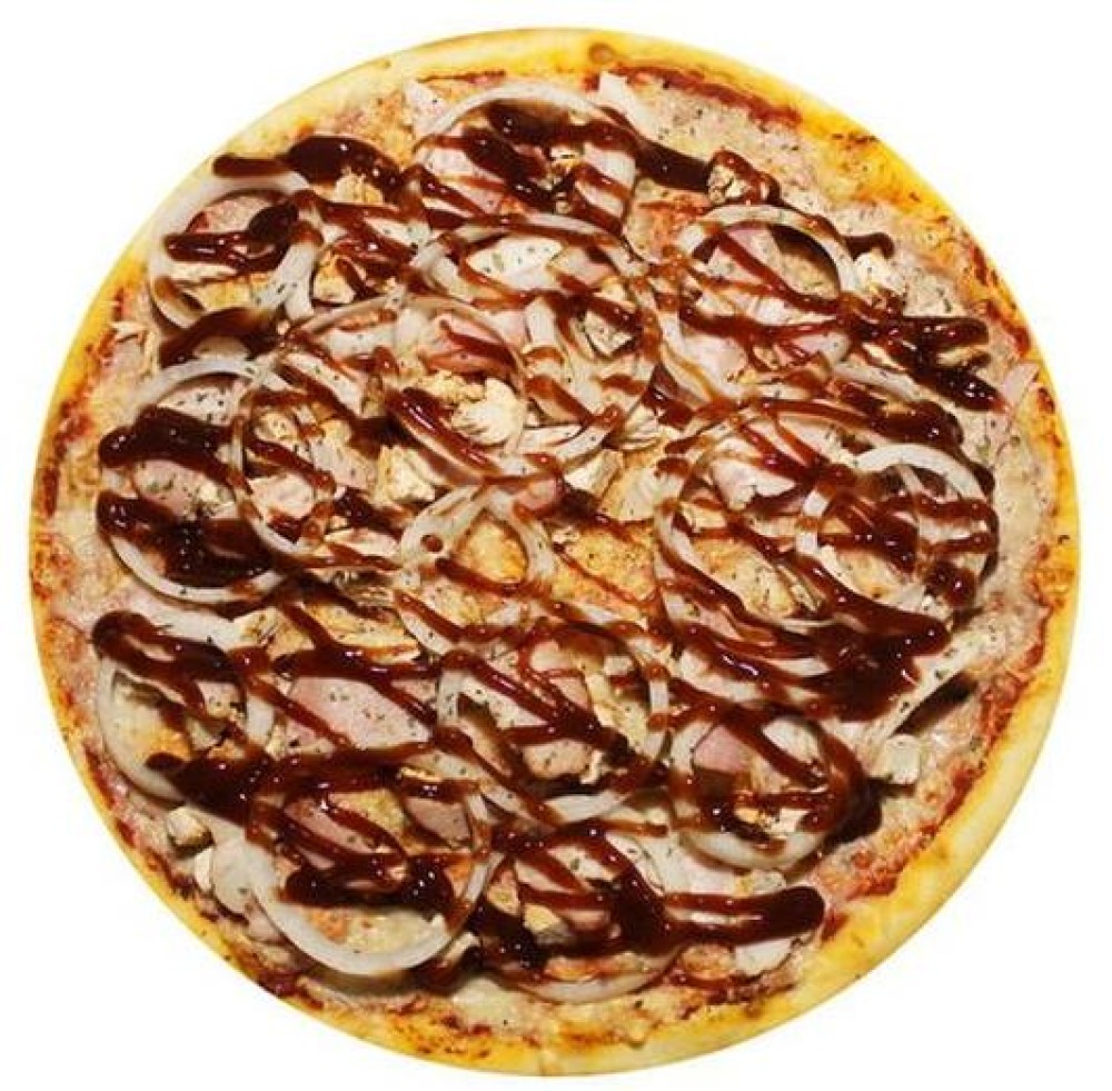 Состав: Ветчина, Ананасы, Цыпленок, Лук красный, Сыр Моцарелла, Пицца соус, Соус барбекю