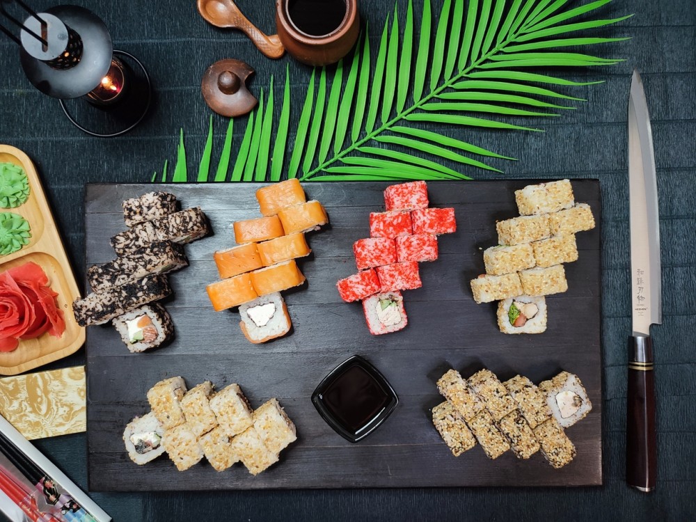 Состав: ролл «Цезарь», ролл «Филадельфия», ролл «Ночной Абакан», ролл «Калифорния », ролл «Киото», ролл «Готен»