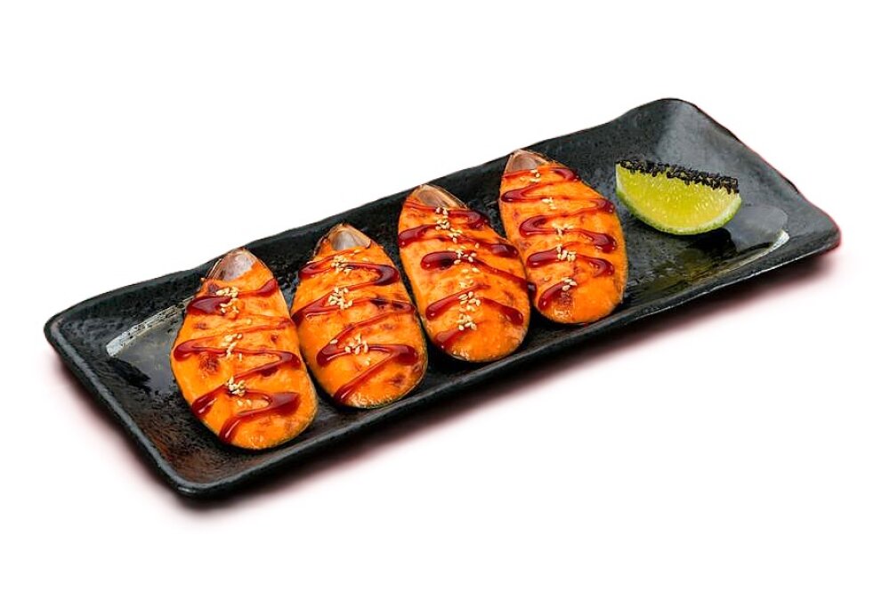 Мидии 4 шт, соус спайси, соус унаги, кунжут