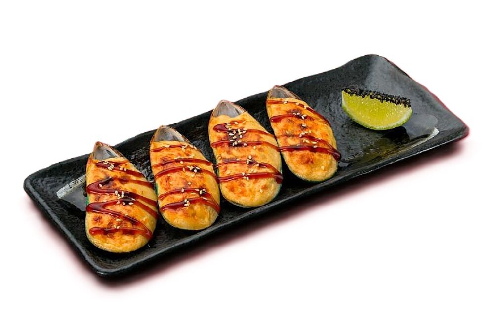 Мидии 4 шт, соус сырно-чесночный, соус унаги, кунжут