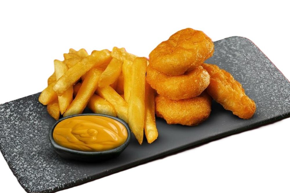 наггетсы 150грамм, картофель фри 80грамм, соус сырный