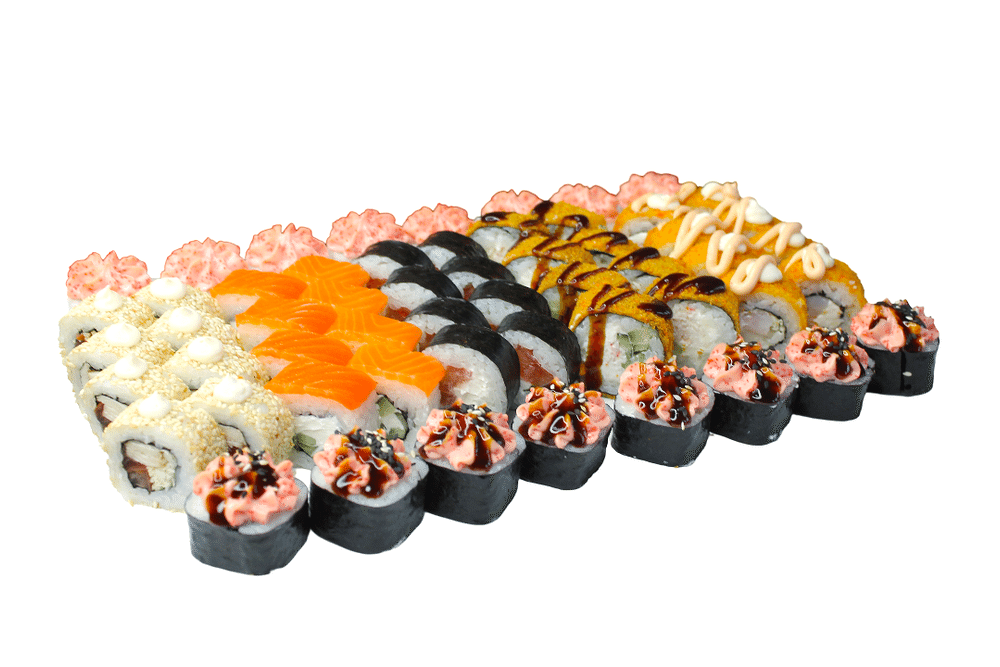 56 штук: Цезарь, Филадельфия лайт, Томато, Краб темпура, Эби темпура хот, Сингапур , Аяши запеченный СОЕВЫЙ СОУС, ВАССАБИ ИМБИРЬ, ПАЛОЧКИ платный, уточняйте у оператора