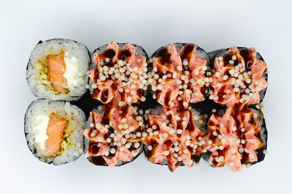 Рис, нори, пекинская капуста, творожный сыр, лосось терияки, соус лава,соус унаги, рисовые шарики