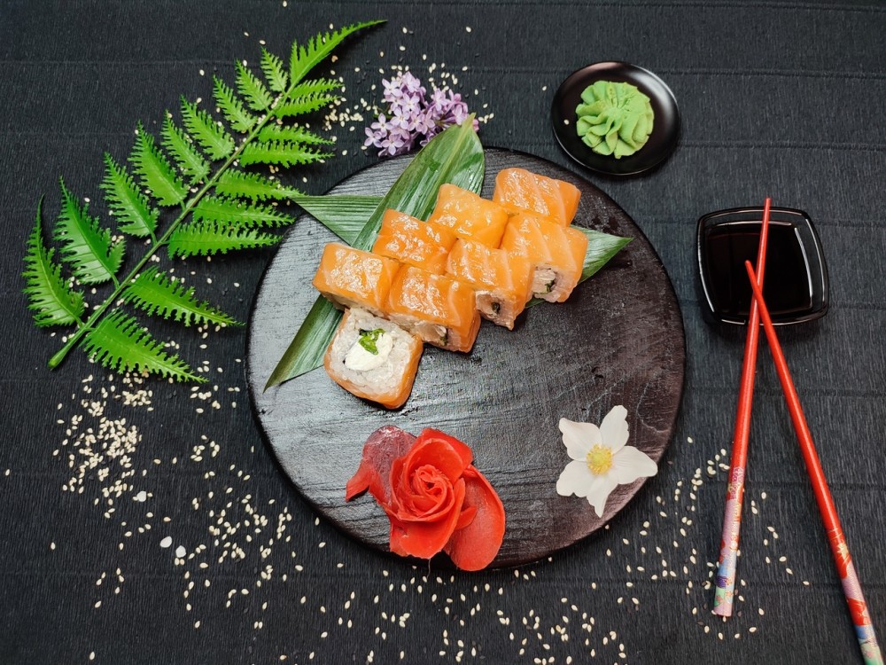 Состав: водоросли нори, лист салата, сыр творожный, лосось стейк, рис