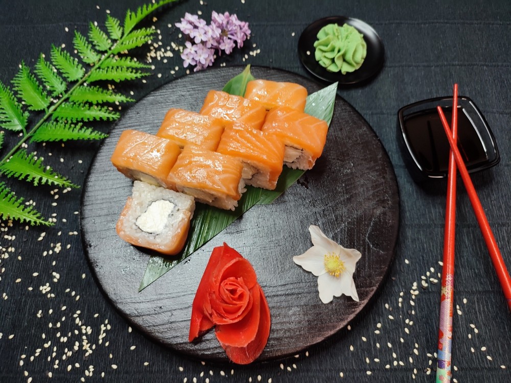 Состав: водоросли нори, сыр творожный, лосось стейк, рис