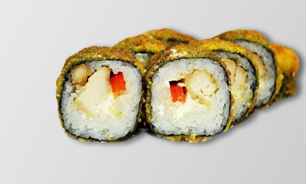 Состав: водоросли нори, сыр творожный, мясо курицы, рис, кляр, перец