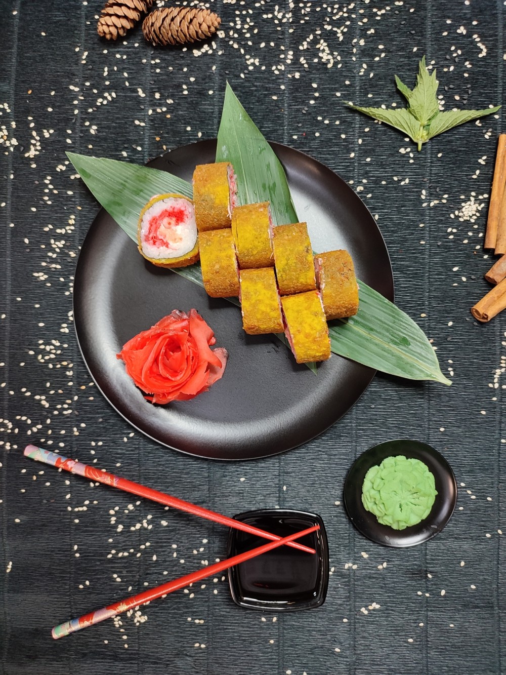 Состав: рис, сыр творожный, водоросли нори, икра тобико, лосось, имбирь, соус спайс, кляр