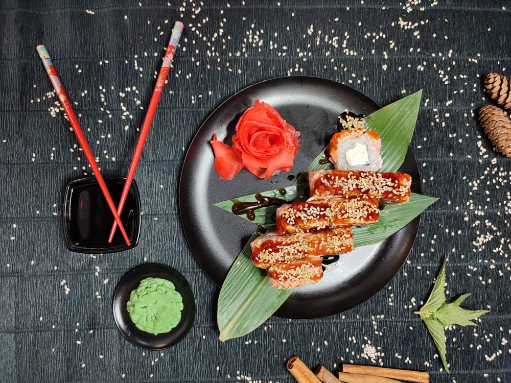Состав: рис, нори, сыр творожный, соус унаги, кунжут, лосось