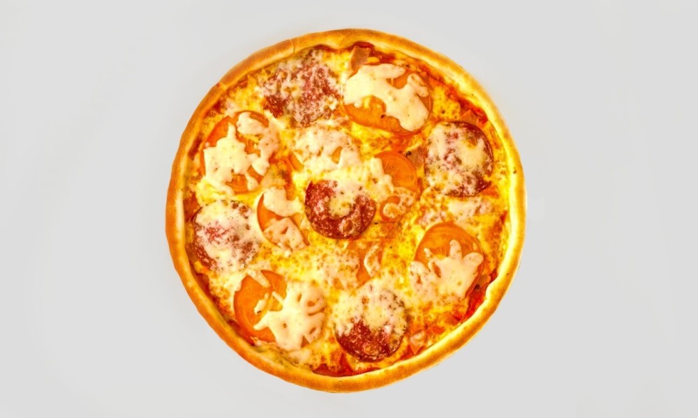 Состав: томатный соус, сыр гауда, сыр моцарелла, соус чили, перчики халапеньо, томаты свежие, ветчина, пеперони.