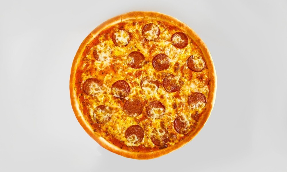 Состав: томатный соус, сыр гауда, сыр моцарелла, томаты, маслины, пепперони